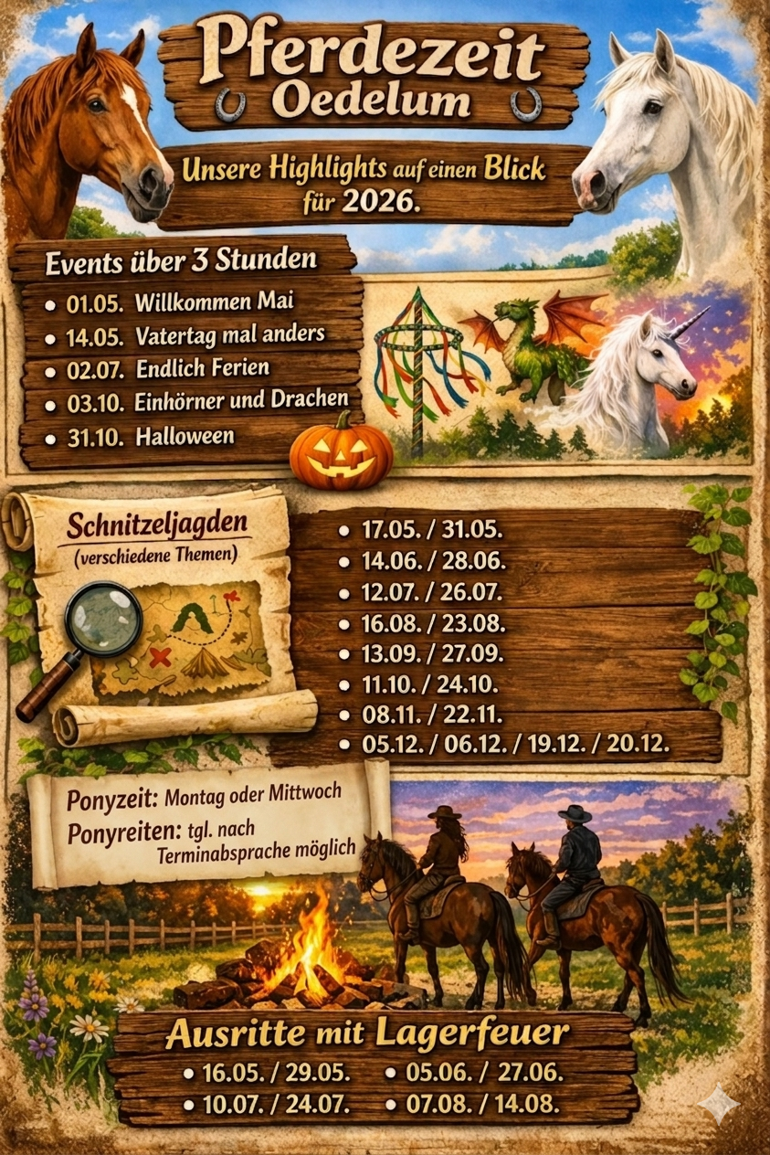 Entdecken Sie unsere spannende Jahresplanung für 2026! Hier finden Sie alle Termine unserer besonderen Aktionen und Events rund um Pferde und Ponys. Planen Sie schon jetzt unvergessliche Erlebnisse mit uns.